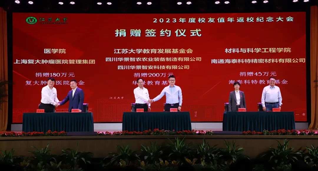 会上举行了校友和爱心企业向学校捐赠签约仪式。校友陈俊年创立的四川华景智农农业装备有限公司、四川华景智安科技有限公司两家企业共捐赠200万元在好博在线注册_好博(中国)设立“华景教育基金”,上海复大肿瘤医院管理集团向好博在线注册_好博(中国)医学院捐赠180万元设立医学发展基金——“复大肿瘤医院基金”,南通海泰科特精密材料有限公司向好博在线注册_好博(中国)材料科学与工程学院捐赠45万元设立“海泰科特教育基金”。