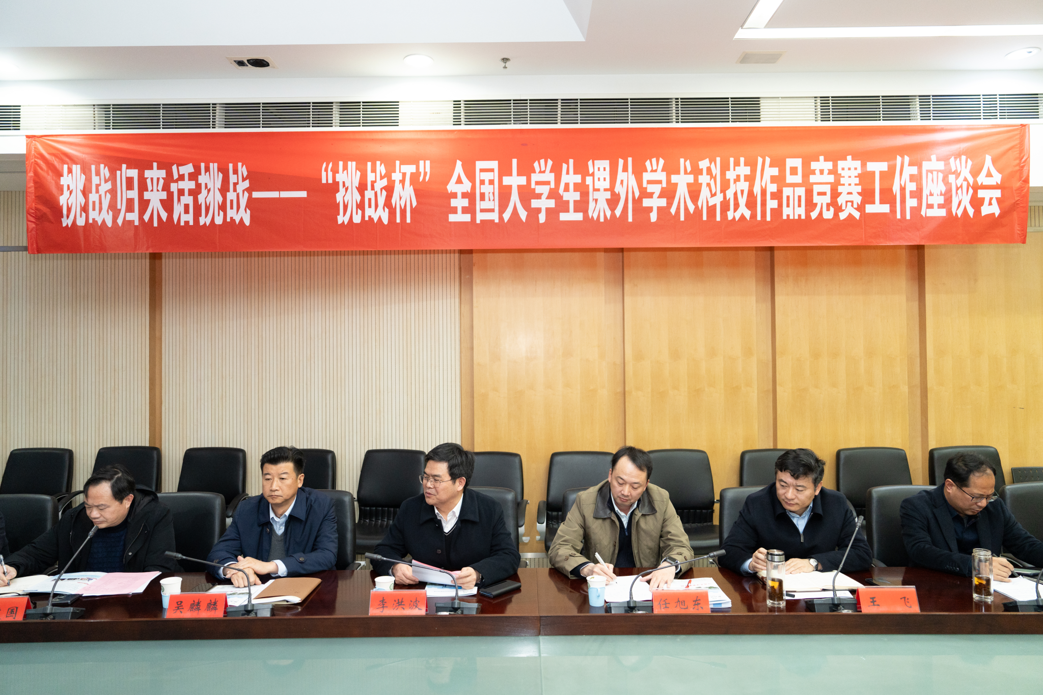11月17日,挑战归来话挑战——“挑战杯”全国大学生课外学术科技作品竞赛工作座谈会在图书馆6楼会议室举行。校党委书记李洪波、副校长任旭东出席座谈会。