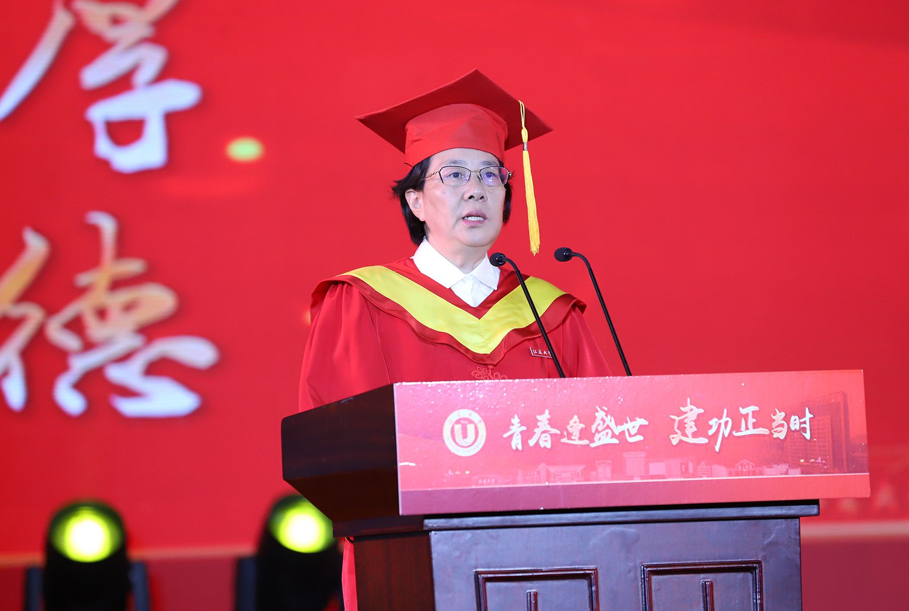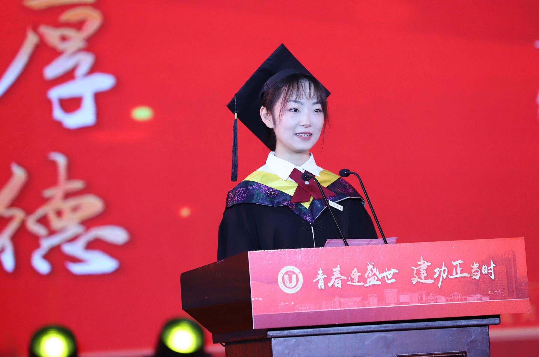 学位授予仪式上,校领导、校党委常委为博士、硕士、学士学位代表颁发学位证书并扶正流苏。