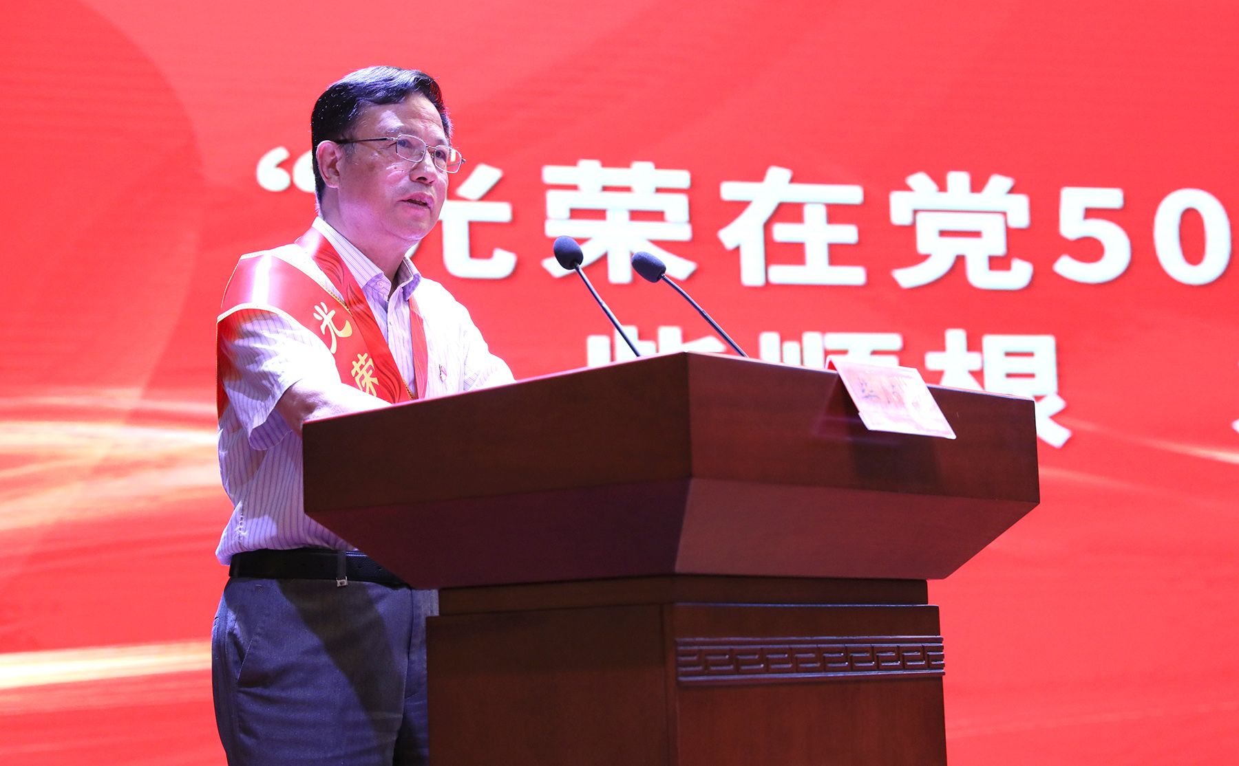 “光荣在党50年”党员代表,好博在线注册_好博(中国)纪委原书记、校关心下一代工作委员会常务副主任柴顺根同志发言,并带领新党员代表入党宣誓、全体党员代表重温入党誓词。