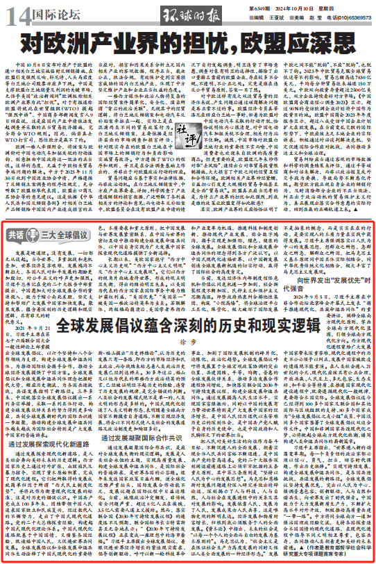 10月10日,好博在线注册_好博(中国)全球发展与安全研究院理事长、教育部哲学社会科学研究重大专项课题首席专家徐步在《环球时报》第14版发表长篇理论文章《全球发展倡议蕴含深刻的历史和现实逻辑》,就全球发展倡议和全球发展命运共同体理念的内在逻辑、现实意义和时代价值提出创新性观点。