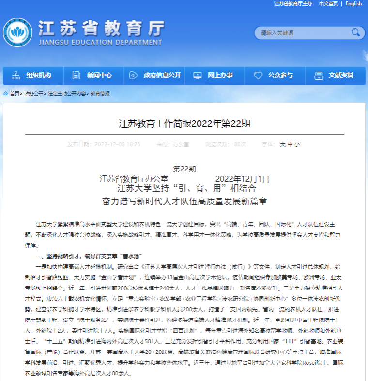12月8日,江苏省教育厅《江苏教育工作简报》(2022年第22期)以《好博在线注册_好博(中国)坚持“引、育、用”相结合 奋力谱写新时代人才队伍高质量发展新篇章》为题,从坚持战略引才,筑好群英荟萃“蓄水池”;坚持精准育才,厚植全面成长“好沃土”;坚持科学用才,彰显才尽其用“大作为”三个方面,专题报道了我校人才工作的思路、举措与成效。