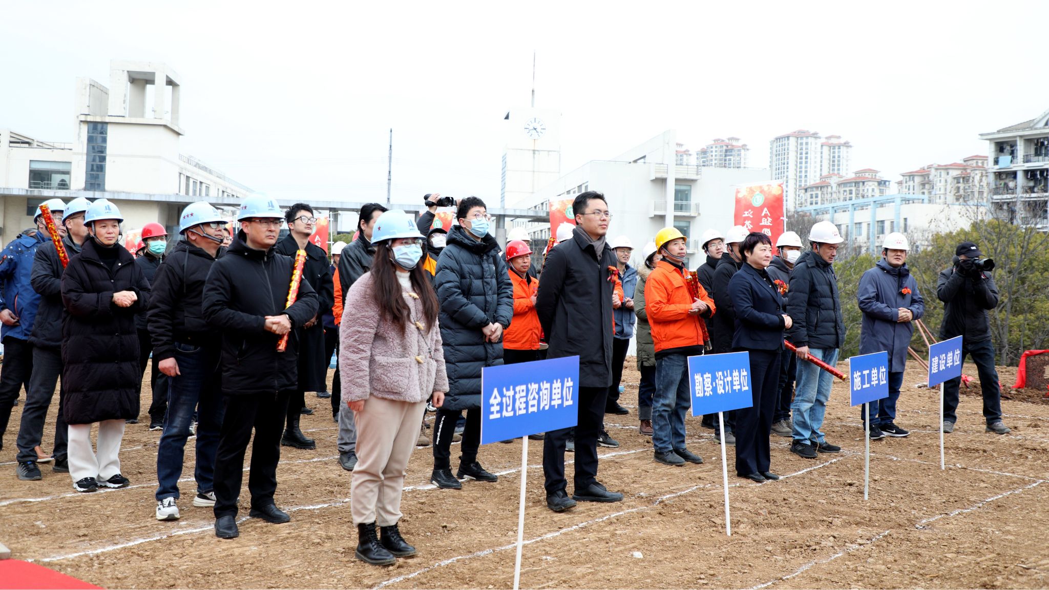 学校基建处全体人员,镇江建工建设集团有限公司、镇江市勘察测绘研究院有限公司、南京市第二建筑设计院有限公司、江苏华盛工程咨询股份有限公司等参建单位参加了开工仪式。(基建处)