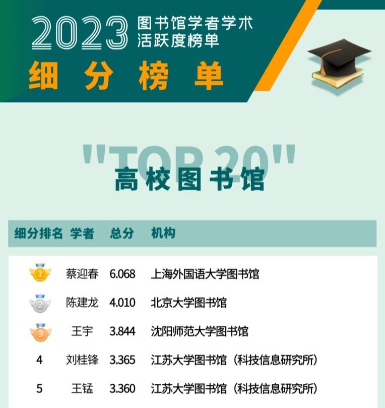 在发布的“2023图书馆学者学术活跃度榜”中,列出了2018年至2022年间在图书情报领域中最具学术活跃度的学者。本次共统计4335位学者,上榜学者433位(前10%),并按分数区间段分为五个等级,其中,A类学者40人、B类学者113人、C类学者85人、D类学者115人、E类学者80人。我校图书馆刘桂锋、王锰、苏文成等11位馆员上榜,其中A类2人,B类4人,C类3人,D类2人。(图书馆)